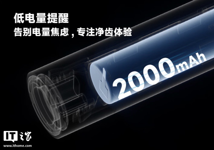 该牙刷提供扫振与声波双模式,刷头匹配杜邦刷毛,采用 45° 黄金倾斜角设计,号称能够精准地对准牙龈沟。牙刷提供 2 分钟刷牙计时功能,设有 30 秒换区提醒。牙刷内置 2000 毫安时电池,拥有至高 90 天续航。
