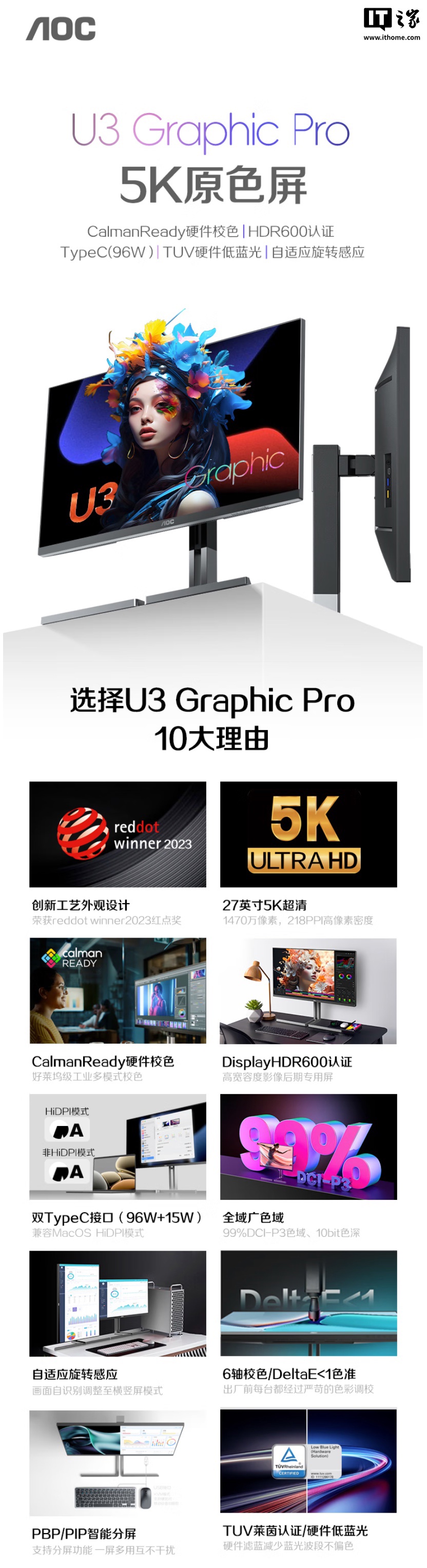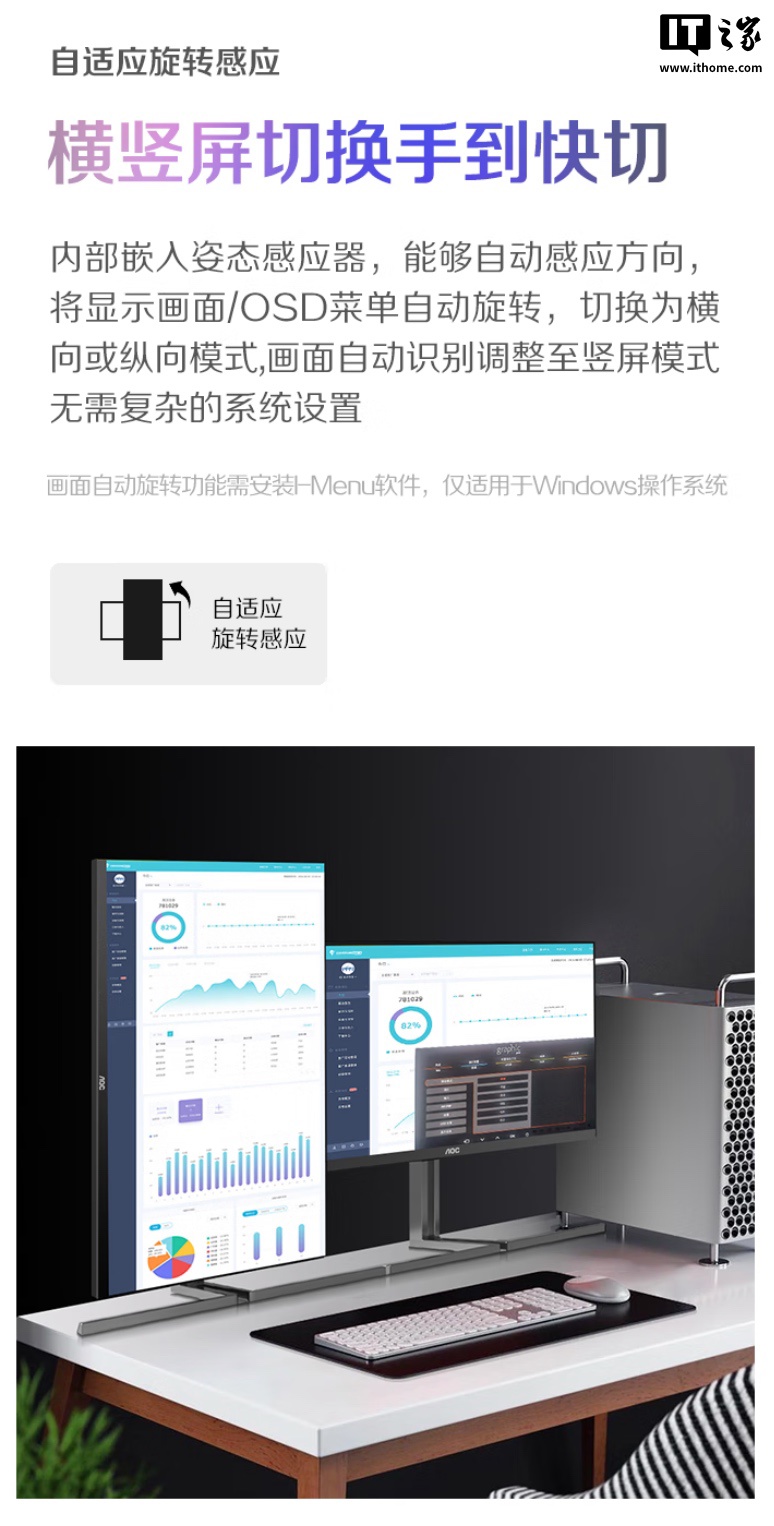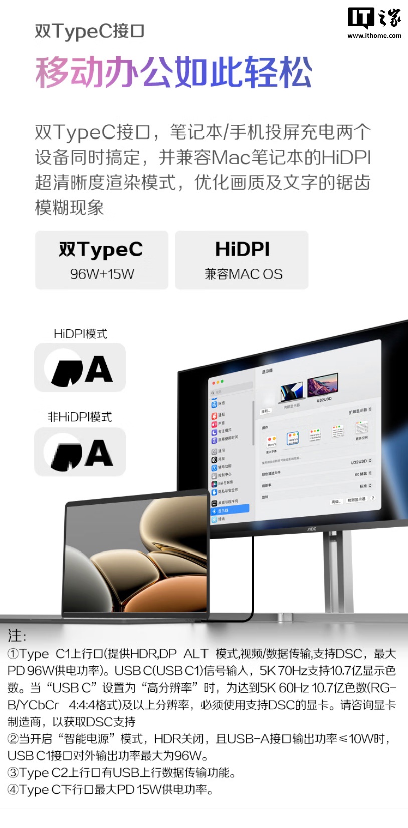 该机支架支持升降 / 倾斜 / 旋转,显示器提供姿态感应器,支持竖屏自动旋转,显示器本体支持 VESA 100x100mm 壁挂,提供双 3W 扬声器,匹配 1 个 HDMI 2.1、1 个 DP1.4、1 个 USB-C 96W、1 个 USB-C 15W 接口。