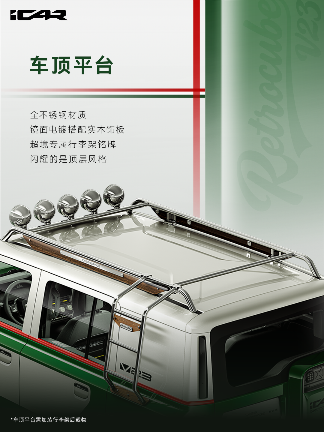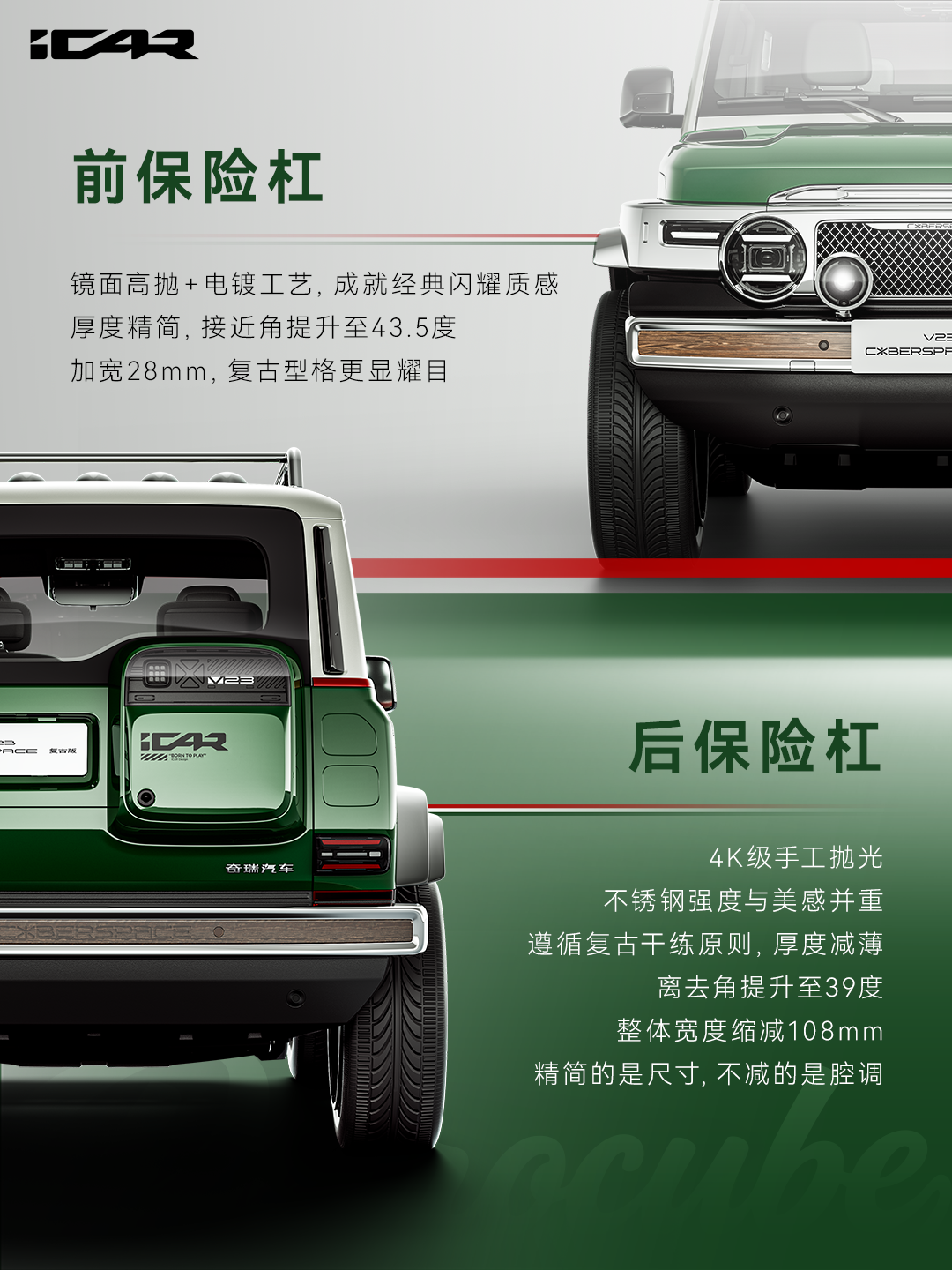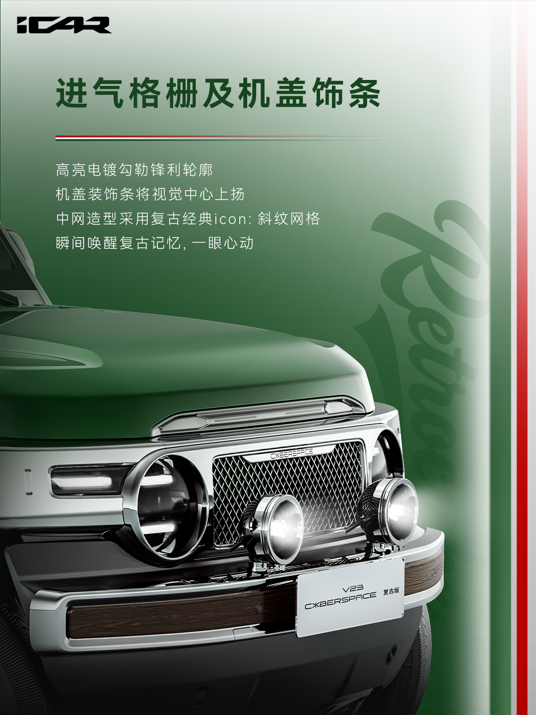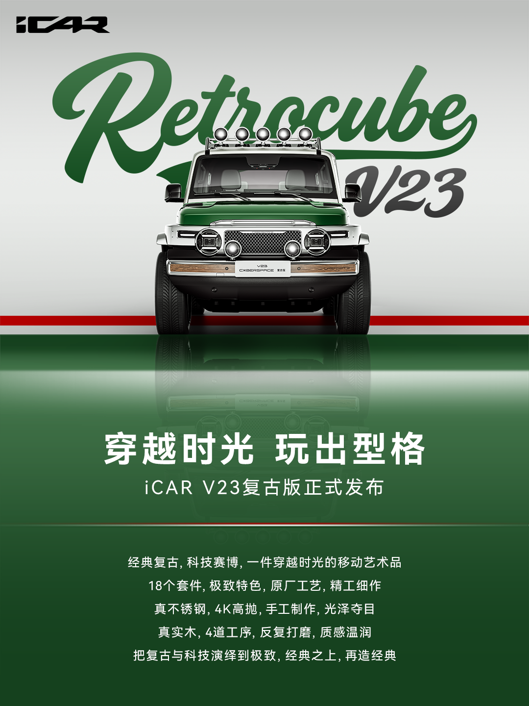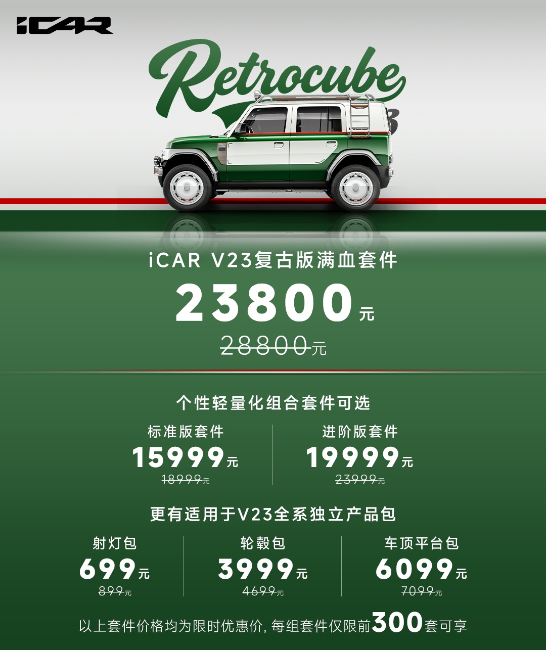 IT之家 7 月 21 日消息,奇瑞今晚推出了 iCAR V23 车型的复古套件,满血套件售价 28800 元,前 300 套立减 5000 元后 23800 元。这些套件采用电镀、实木等材质,凸显金属质感。