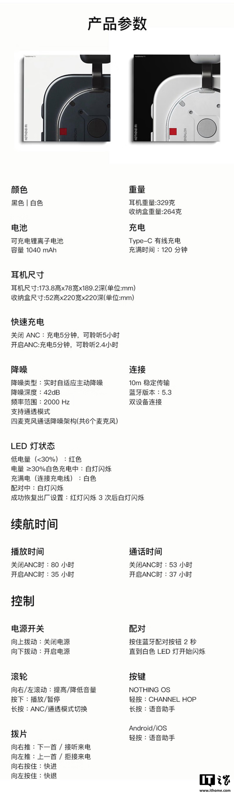 其他方面,Nothing Headphone (1) 搭载蓝牙 5.3,支持双设备配对,可让耳机在笔记本电脑和手机之间无缝切换。IT之家附参数如下: