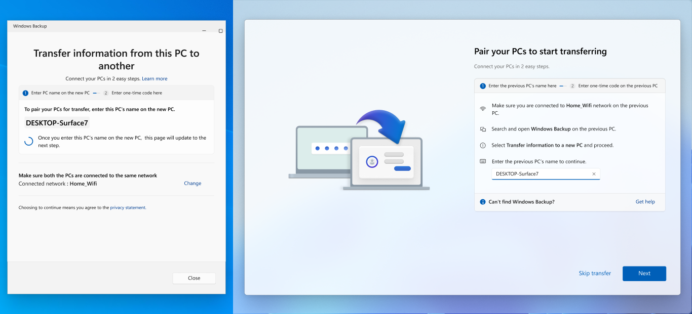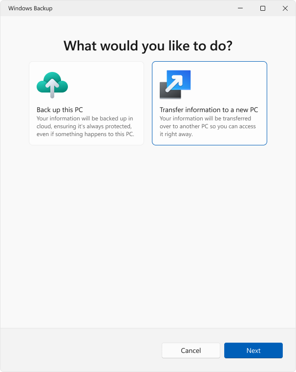 在 Windows 备份应用中,选择“将信息传输到新电脑”以开始配对。