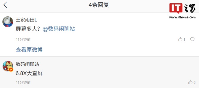 有用户询问新机屏幕大小,博主回复称“6.8X 大直屏”。