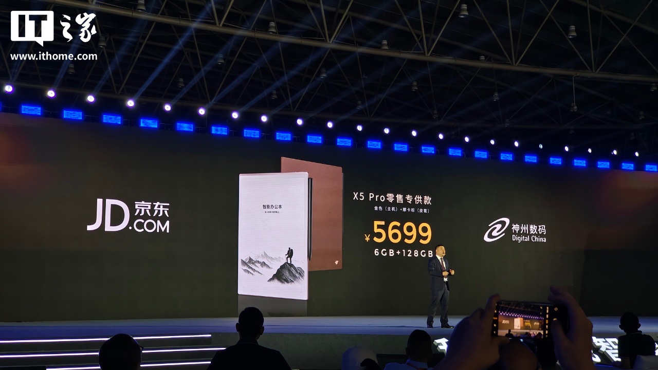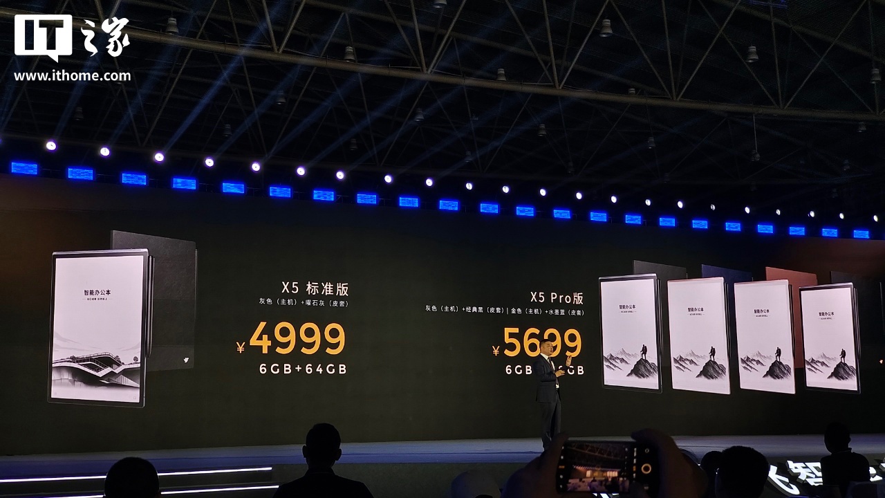 IT之家 7 月 22 日消息,在目前正在进行的科大讯飞发布会中,科大讯飞智能办公本 X5 系列电纸书正式登场,系列电纸书主打商务用途,提供“会议录音转文字、墨水笔纸感书写、AI 自适应会议纪要”功能,标准版(64GB 存储空间)定价 4999 元起,Pro 版(128GB 存储空间)定价 5699 元起。