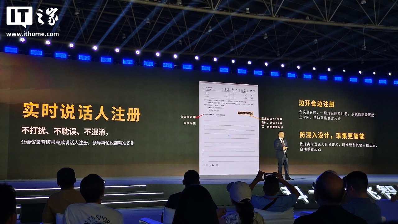 系统软件方面,官方重点介绍该机支持手写笔记 OCR 纠错、会议录音转文字、实时语音转文字,同时还支持实时说话人注册功能(根据不同人声自动新建匹配不同说话人),支持中 / 英 / 方言免切换,还能通过会议语音内容生成 AI 纪要。