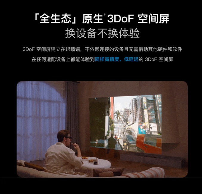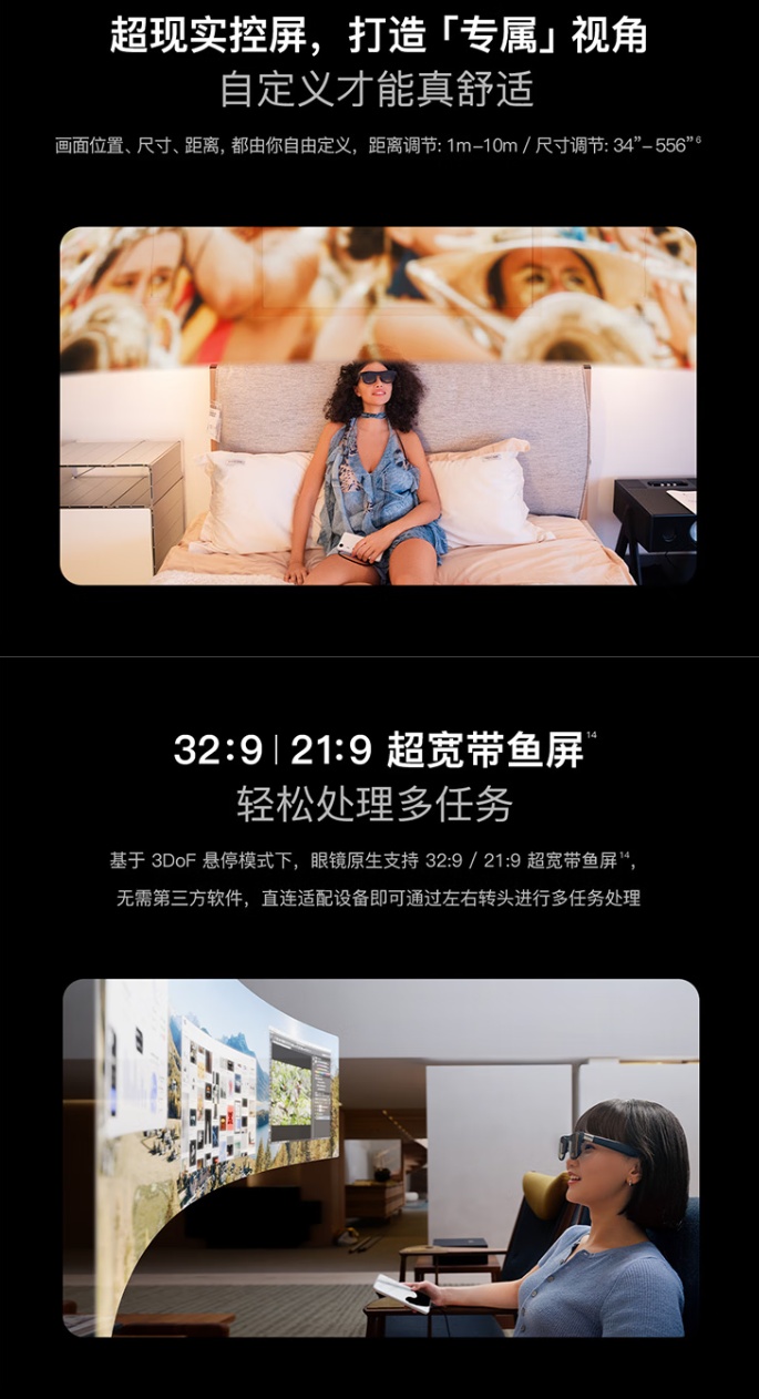 据官方介绍,这款 AR 眼镜搭载了 X1 自研空间计算芯片,支持调整 1m-10m 的画面距离,画面尺寸可调 34"-556",全局刷新率最高可达 120Hz,延迟为 3 毫秒(M2P 标准)。