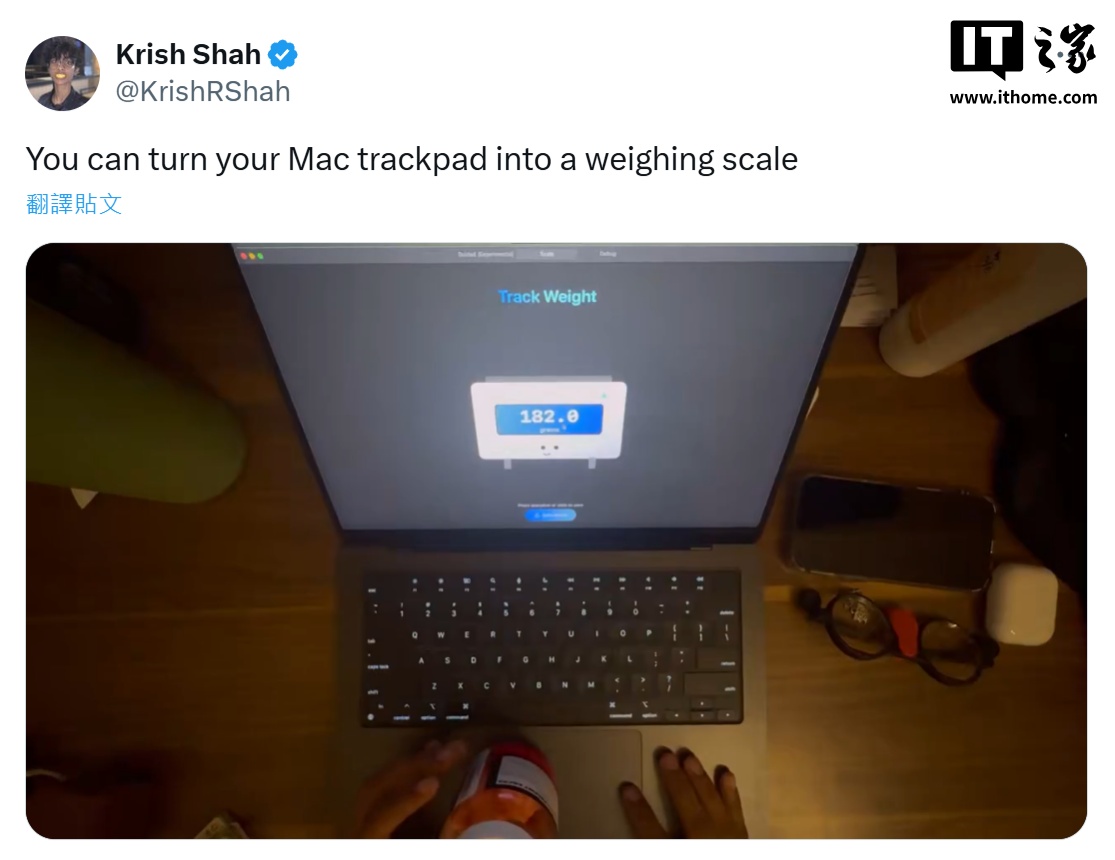 后续 Krish Shah 在 X 平台发布了演示视频,用该项目测量了一罐健身软糖的重量,视频中这罐软糖在触控板上测得的重量为 182 克,在普通电子秤上测量重量为 180 克,误差大约是 2 克。