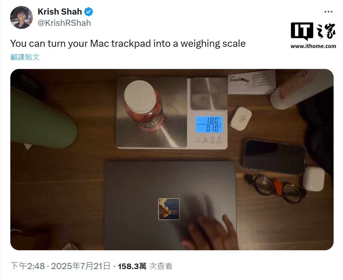 IT之家 7 月 22 日消息,开发者 Krish Shah 和 IndieD3v 昨日在 GitHub 上发布了 TrackWeight 项目,能够让苹果 MacBook 笔记本的“力度触控”技术触控板摇身一变,成为电子秤。