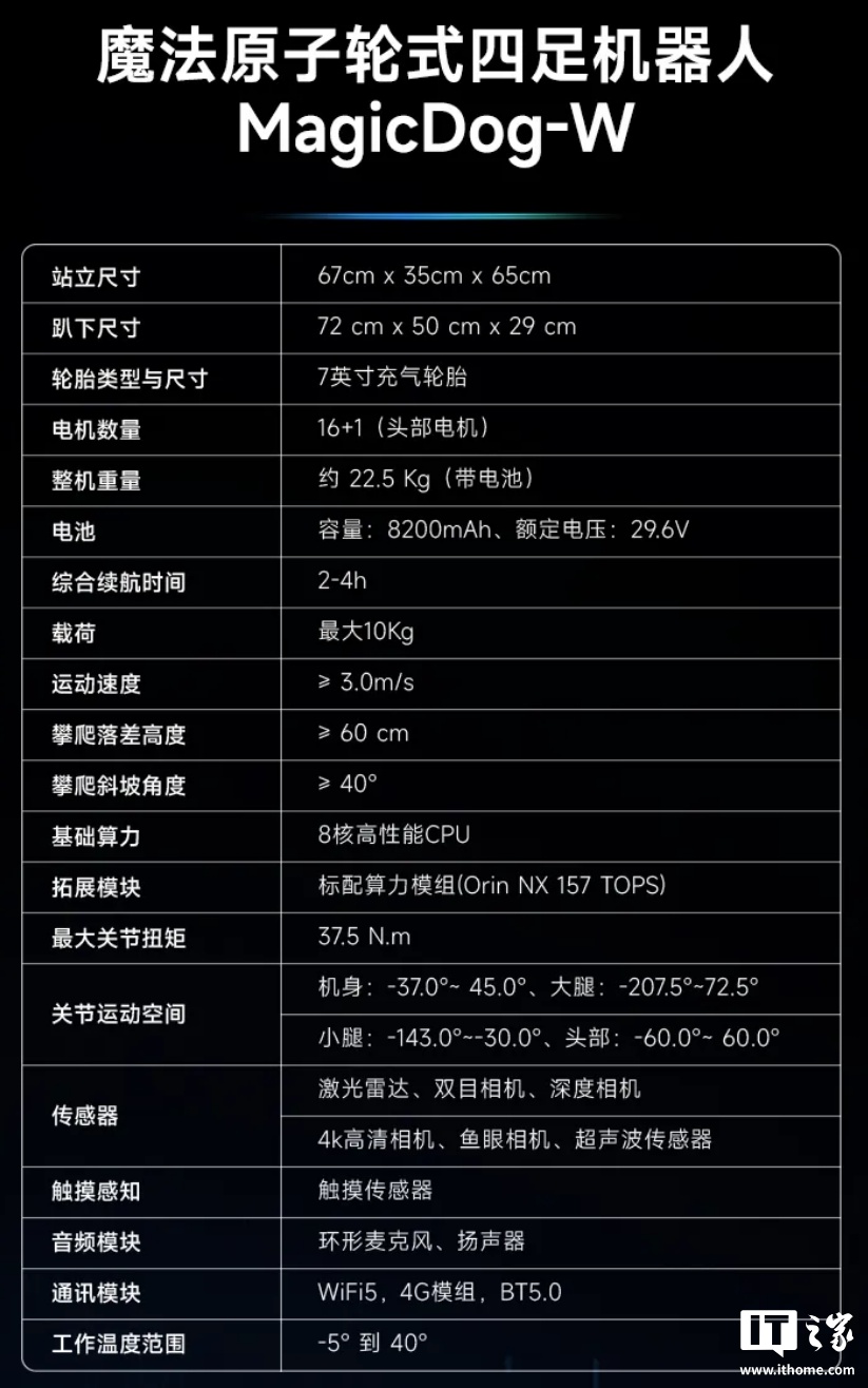 该机器人的价格暂未公布,IT之家附 MagicDog-W 轮式四足机器人配置表如下: