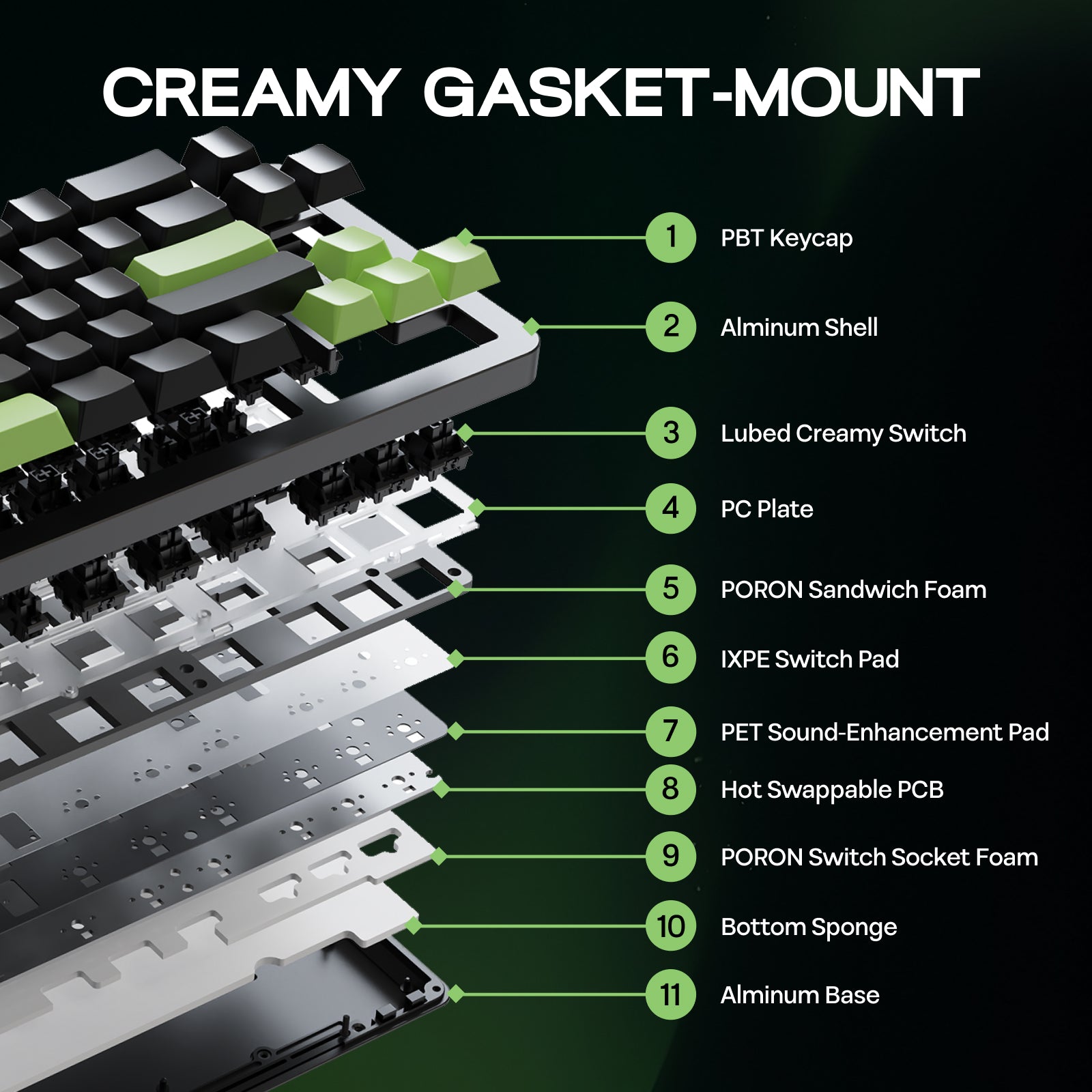 Epomaker Galaxy68 整体采用 Gasket 垫片固定结构,内含共计五层的吸声填充,拥有包含单键下灯位 + 方向键上方徽标灯 + 底部三区氛围灯的三重 ARGB 组合。