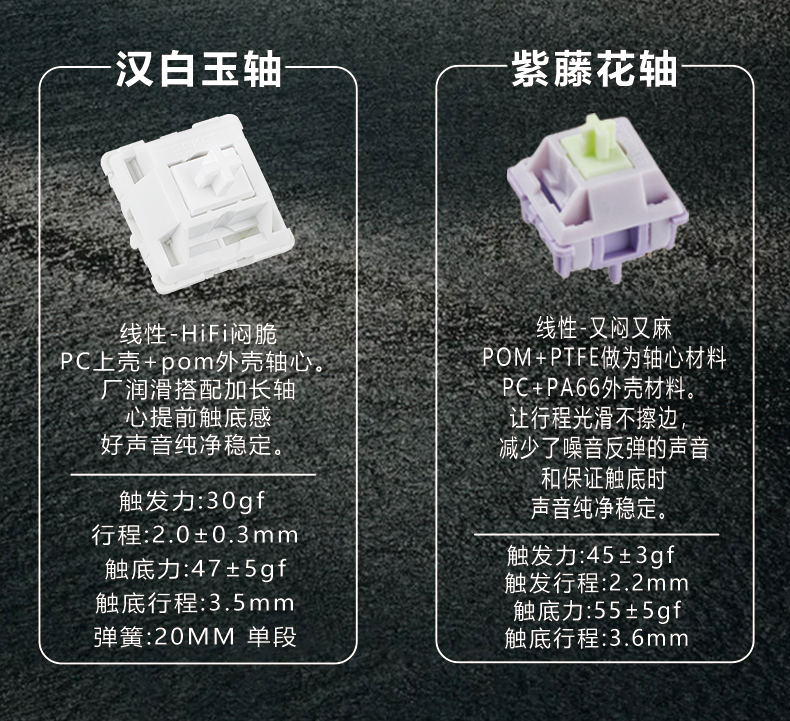 该键盘支持轴体热插拔,预装击键更 HiFi 的汉白玉轴或透光更佳的紫藤花轴这两种线性轴体,配备原厂高度 PBT 材质键帽。键盘支持 VIA / QMK 开源驱动。