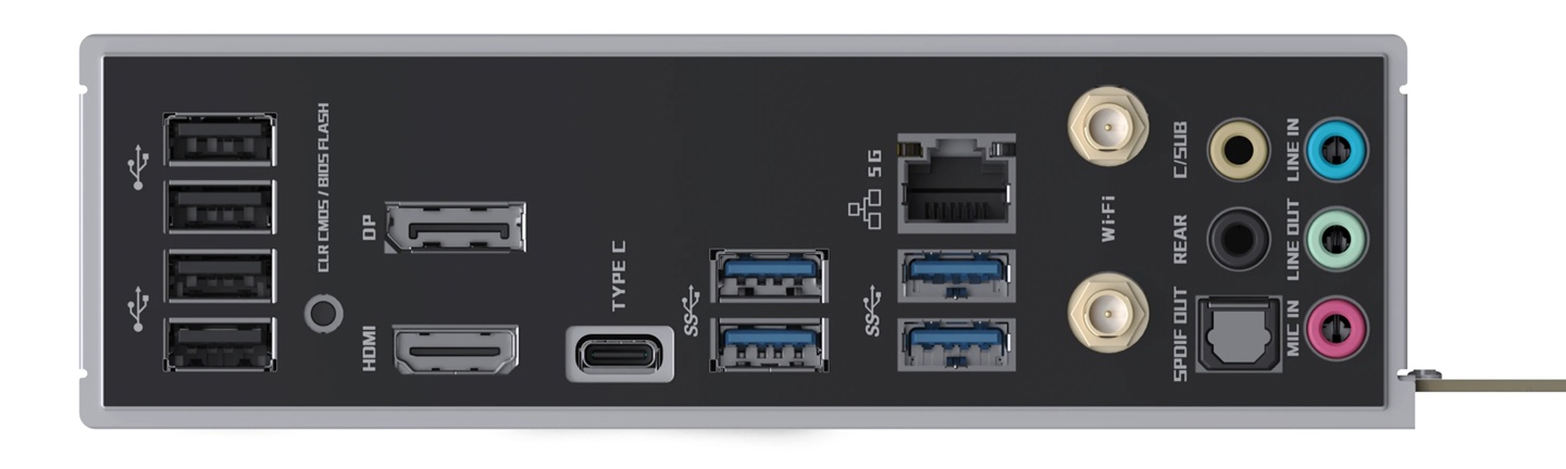 来到后置 I/O,可以看到铭瑄为该主板在后窗提供了共计 8 个 USB-A (4×2.0 + 4× 3.x),1 个 USB-C、1 个 HDMI、1 个 DP、1 个 5GbE RJ45、一组 Wi-Fi 天线插孔、1 个 S/PDIF-out、5 个音频插孔。