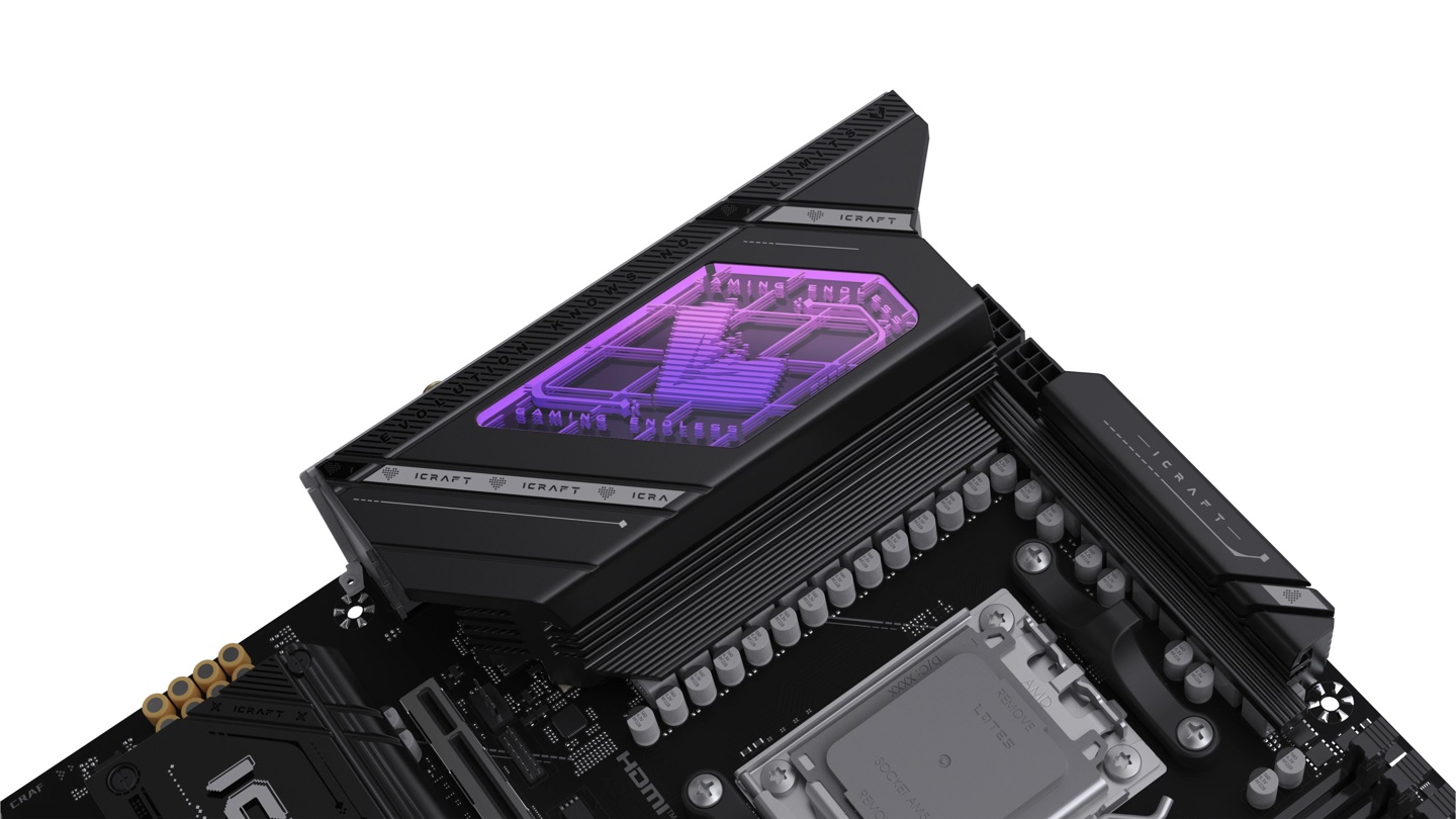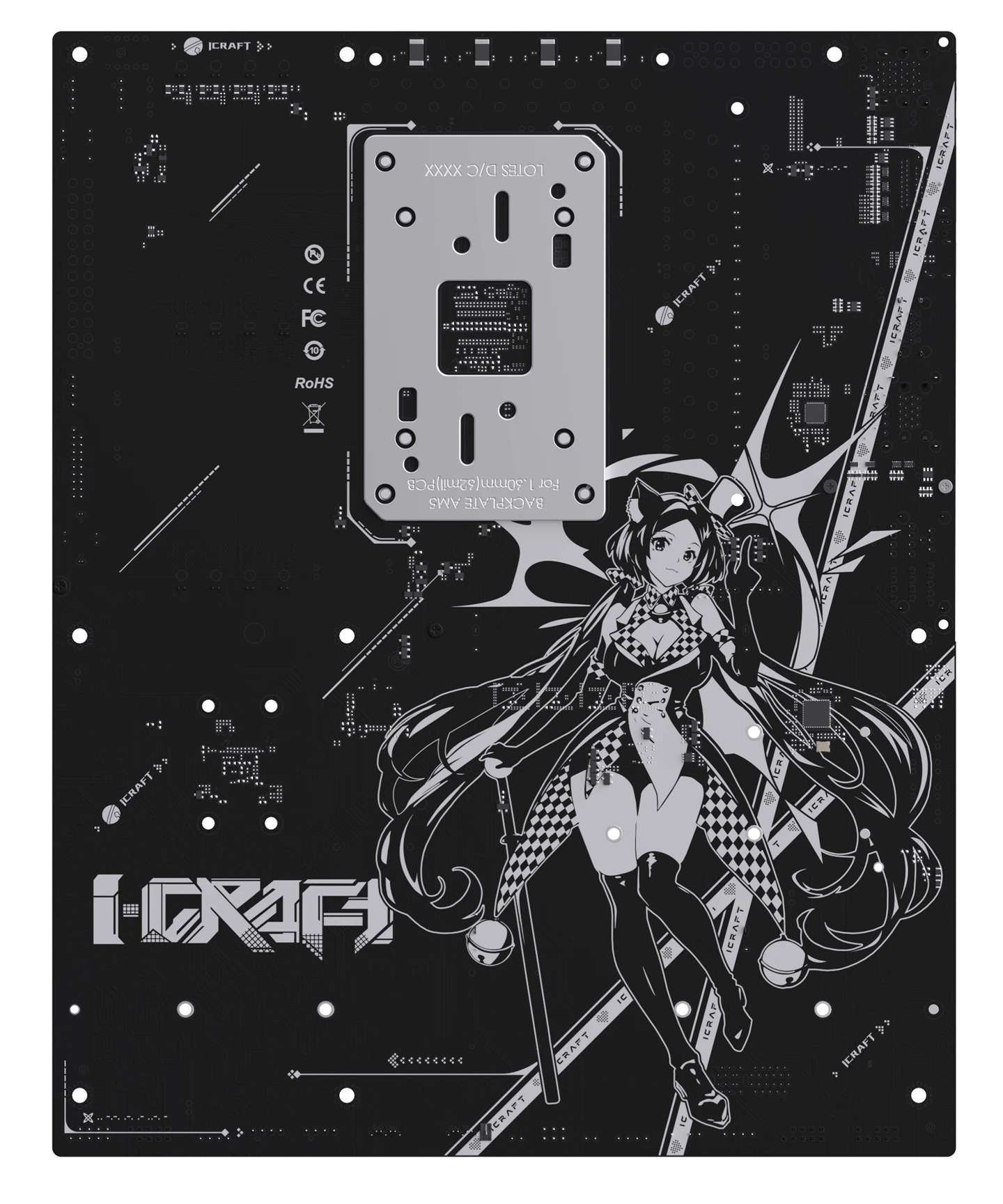iCraft B850 AIGA 主板以黑色为设计基调,左上角 VRM 装甲拥有显示 iCraft 系列 V 形徽标的无限镜光效区、右下方覆盖芯片组和 M.2 盘位的马甲上则有萌版“瑷珈”形象变色彩绘、背板也印有“瑷珈”主题图案。