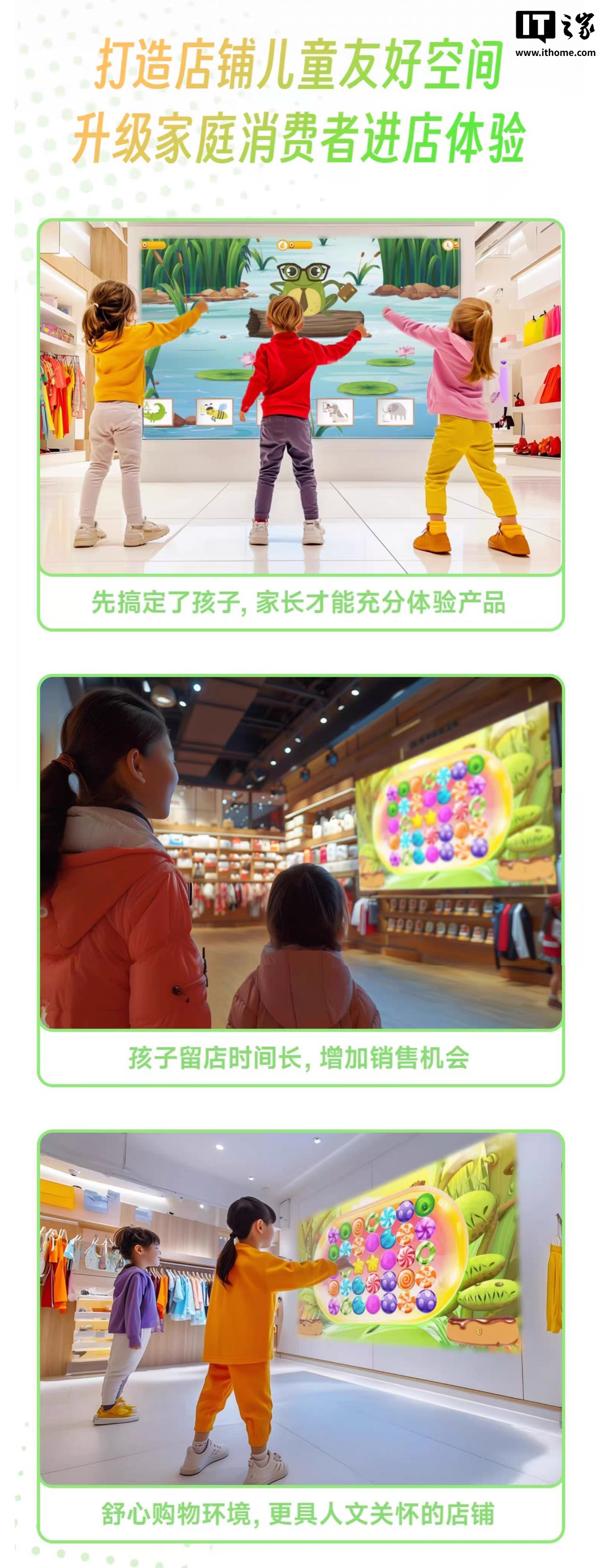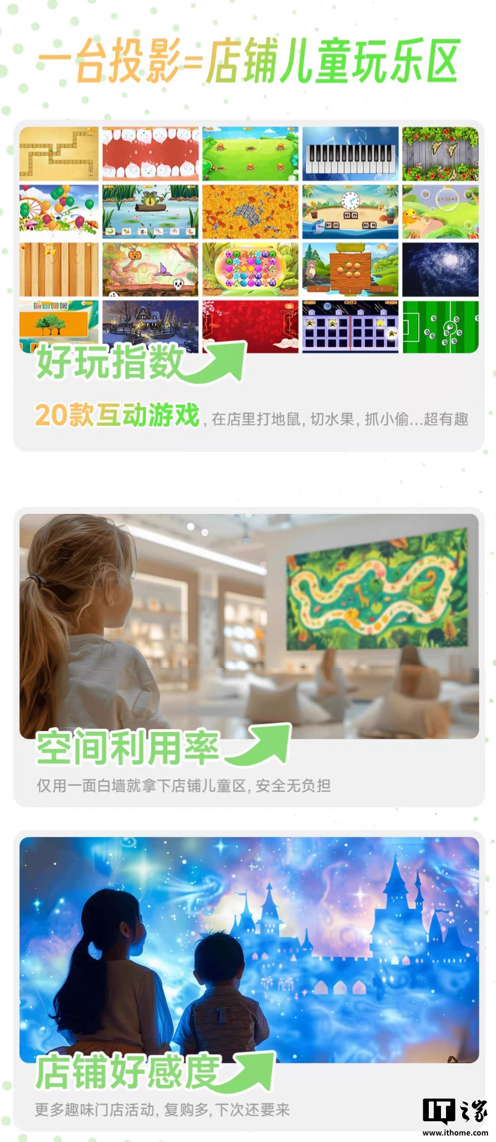 官方强调这款投影仪适合用于实体店铺使用,以提升顾客留店时间,增加销售机会。投影仪内置 20 款互动游戏,可以让顾客在店里“打地鼠、切水果、抓小偷”。