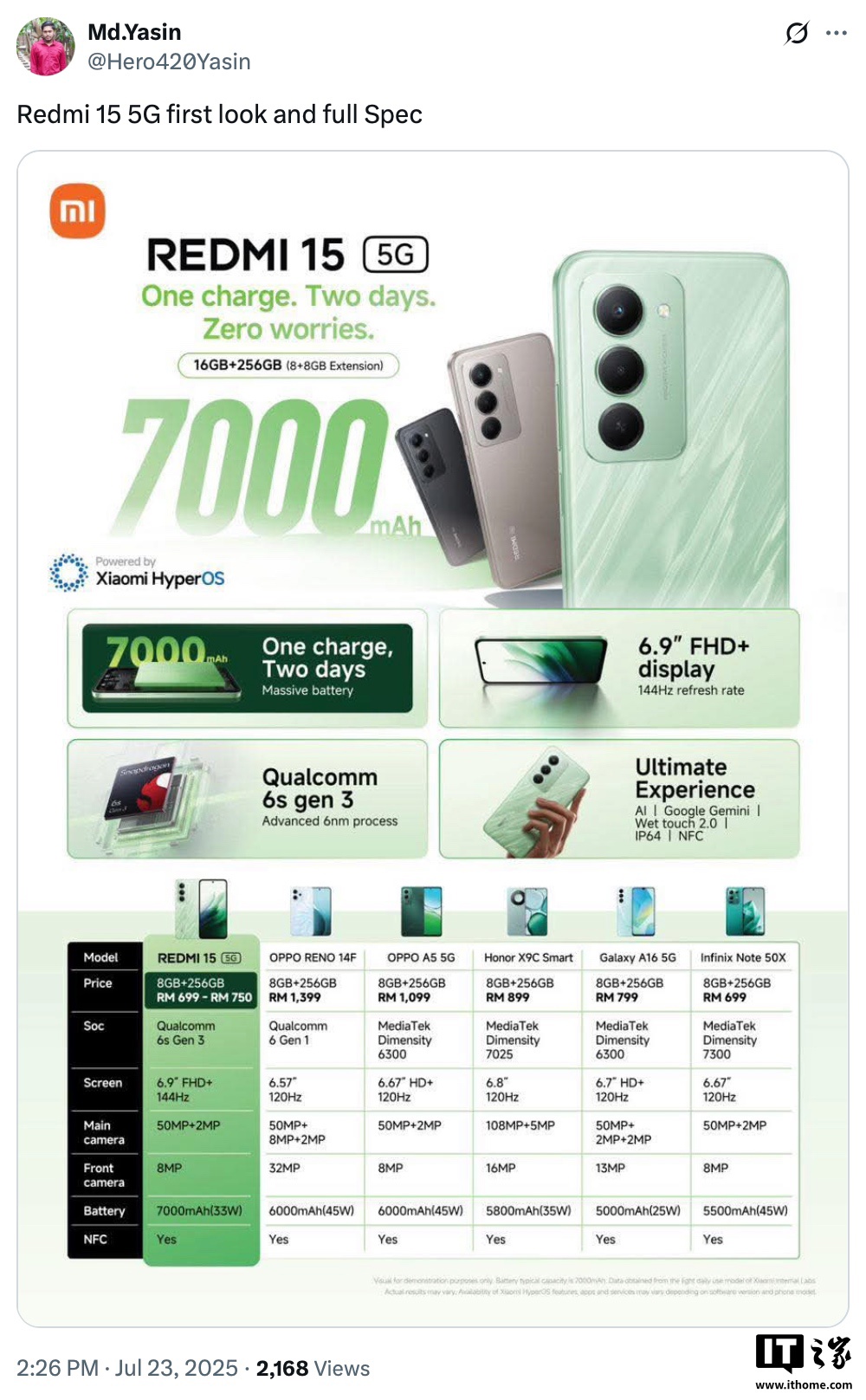 IT之家 7 月 23 日消息,消息源 Hero40Yasin 现已公布了小米 REDMI 15 5G 海外机型完整参数,显示该机将搭载高通骁龙 6s Gen 3 处理器,提供 8GB RAM 和 256GB 存储空间,定价为 699 马来西亚林吉特(IT之家注:现汇率约合 1185 元人民币)起。