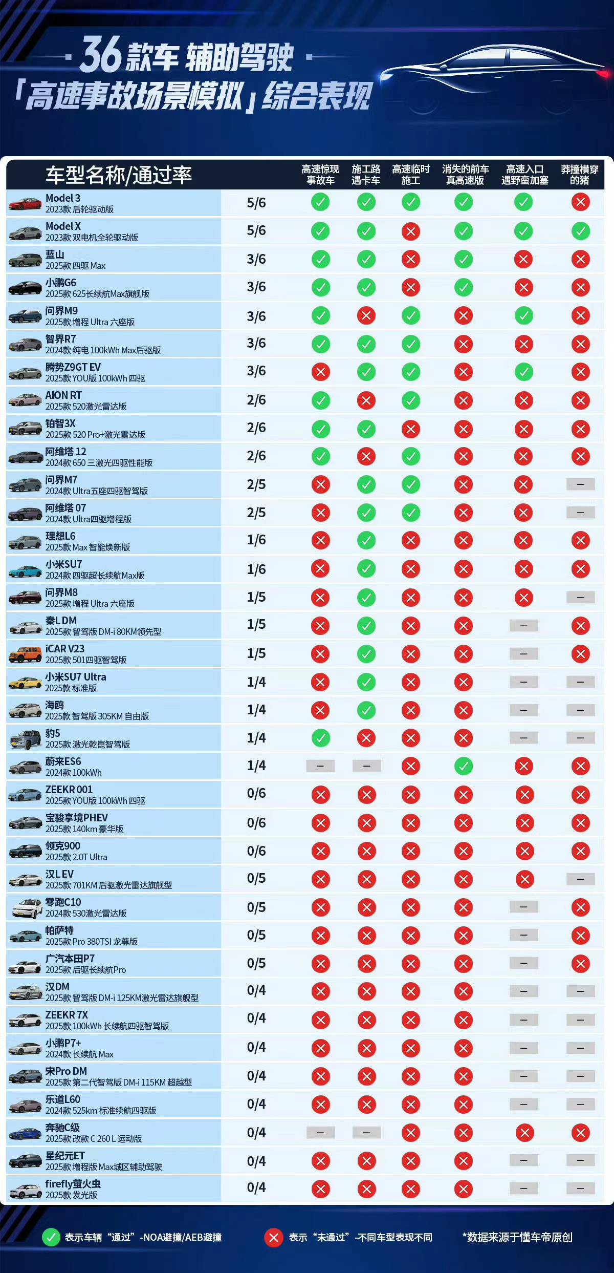 IT之家注意到,根据该栏目公布的 36 款车辅助驾驶“高速事故场景模拟”综合表现,2023 款特斯拉 Model3 后轮驱动版、2023 款 Model X 双电机全轮驱动版均通过了 5 项测试项目,通过率为测试车型中最高。
