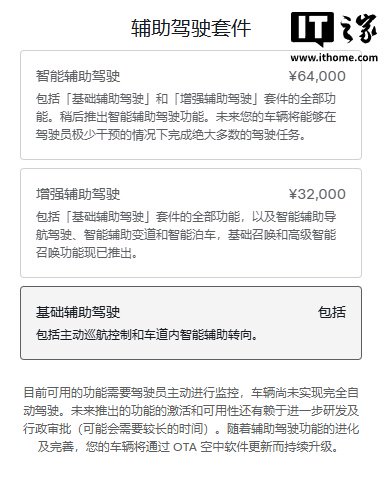 IT之家注意到,特斯拉中国官网今年 3 月调整了辅助驾驶系统的命名,“Autopilot 自动辅助驾驶套件”改名为“辅助驾驶套件”,其中的“FSD 智能辅助驾驶”改名为了“智能辅助驾驶”,价格为 6.4 万元。