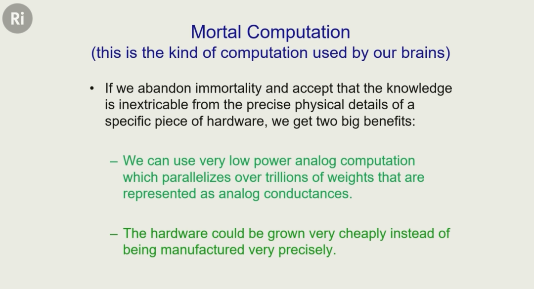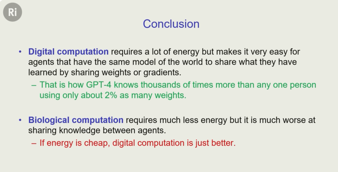 这就很可怕了。更可怕的是,Hinton 还发现,数字智能拥有着人类永远无法拥有的致命优势 —— 它们可以永生!