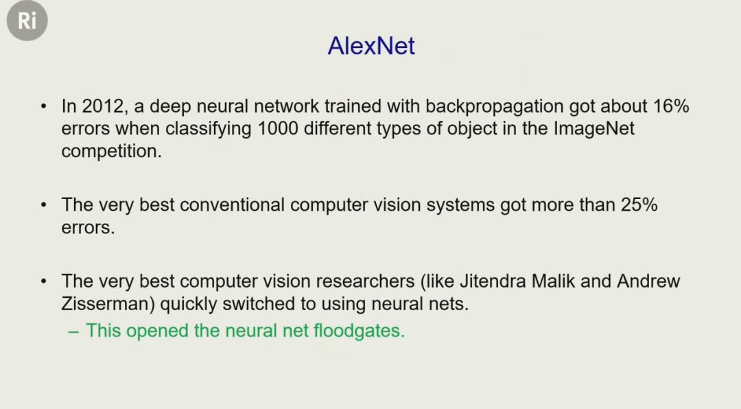 到了 2022 年,Hinton 的两个学生 Alex Krizhevsky 和 Ilya Sutskever 开发出了 AlexNet,远超当时的图像识别系统,从而引爆整个 AI 领域。