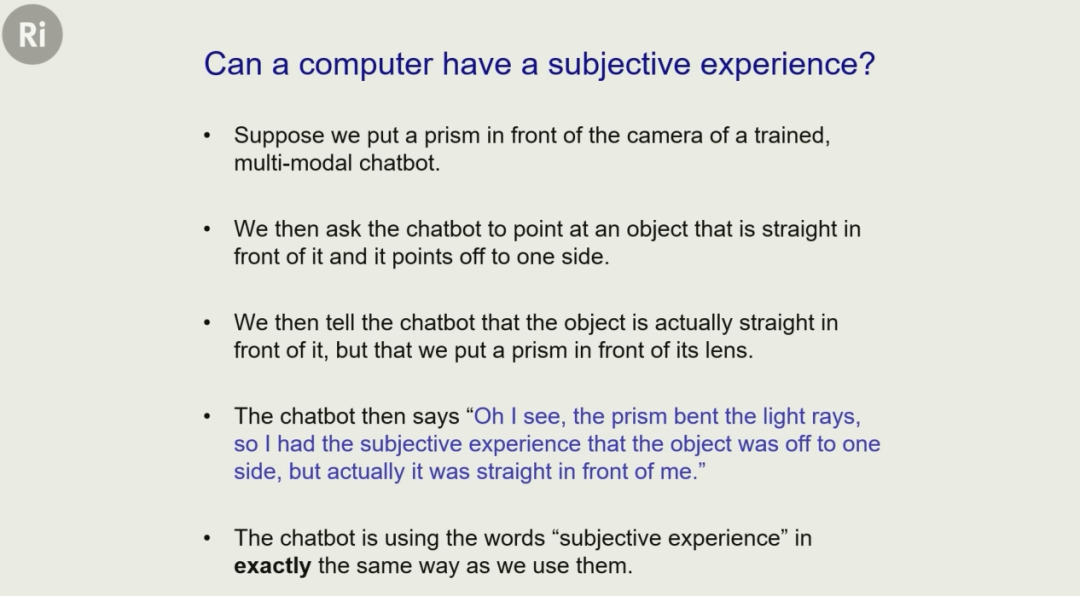 但 Hinton 表示,并不是只有我们才有主观体验,而 AI 就没有。