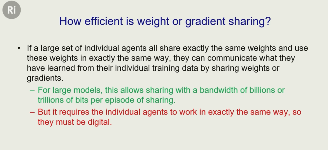 比如我们说一句话,可能只有 100 比特信息。但 AI 系统可以有上万个完全相同的副本,每个副本处理不同的数据子集,权重平均合并后能立刻同步,一次就能传输数万亿比特信息。