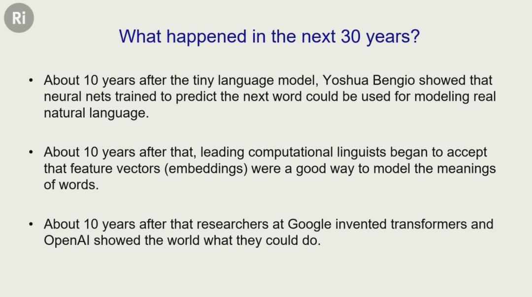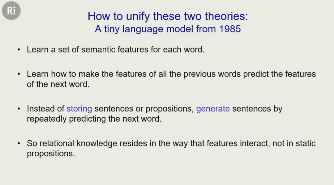 而 Hinton 表示,自己在 40 年前提出的一个模型,可以说是今天大语言模型的祖先。