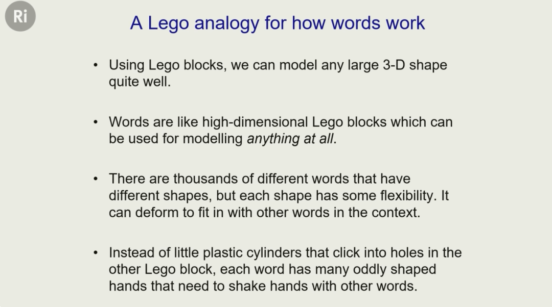 我们有 10 万个词,就有 10 万种不同积木。通过调整词的形状来「牵手」,构建一致的结构,就类似蛋白质的折叠一样。