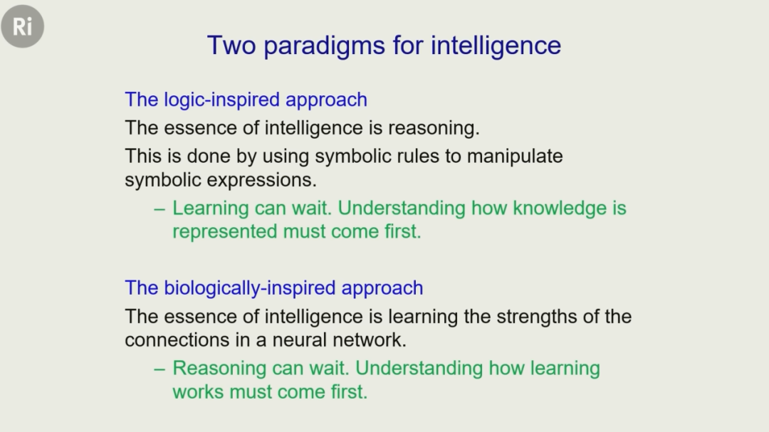 在演讲一开始,Hinton 就指出,智能有两种范式。