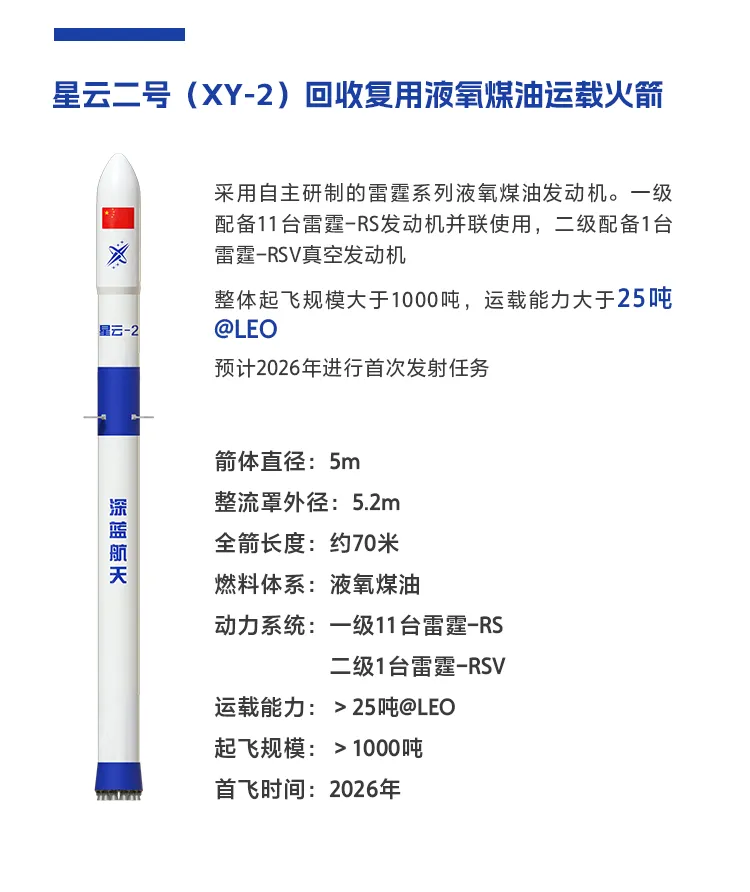 IT之家查询获悉,星云二号直径 5 米,采用 11 台“雷霆 RS”并联,近地轨道运载能力超 25 吨,计划于 2026 年首飞。