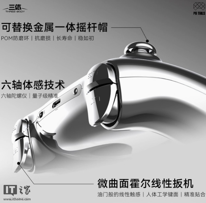 手柄配有六轴陀螺仪、微曲面霍尔线性扳机、可替换金属一体摇杆帽。