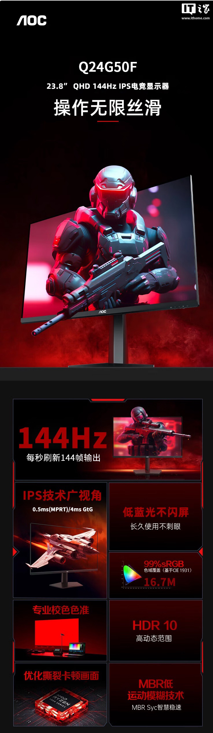 IT之家 7 月 27 日消息,AOC 旗下“Q24G50F”23.8 英寸显示器现已在京东开启首销,这款显示器主打 2K 144Hz,首发价 739 元。