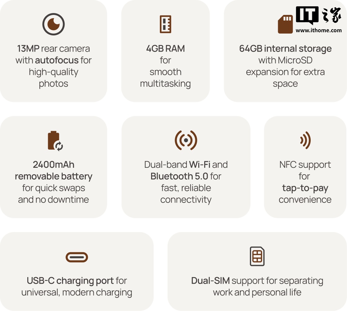 硬件参数方面,官方并未公开这款手机所采用的处理器,但宣称其搭载的 4GB 内存可“足够流畅地运行多任务应用”,支持双频 Wi-Fi、蓝牙 5.0 和 4G 双卡双待,足以应付现代通讯,电池采用可拆卸设计,容量为 2400mAh。