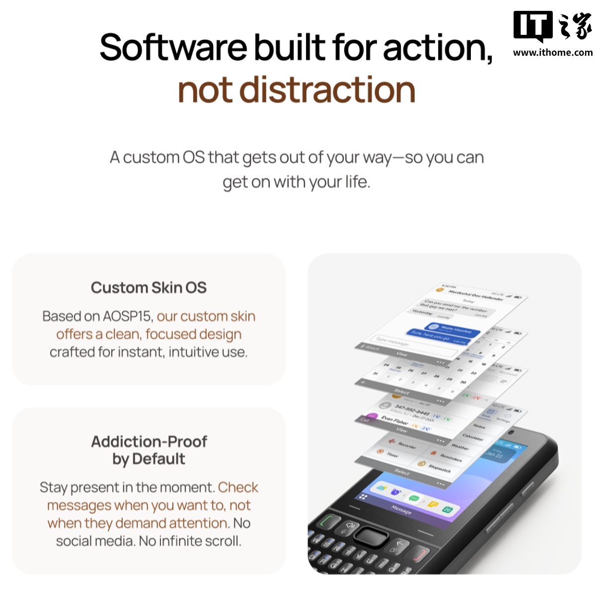 据介绍,这款手机的核心卖点是其近似功能手机的外观设计,官方称使用这款手机可以“远离智能手机的喧嚣,专注于宁静的通信”;使用的操作系统是基于 Android 15 打造的 Skin OS,其界面、操作逻辑专为键盘重设计,主打“纯净系统”,主界面外观酷似 S60V5/塞班 3。
