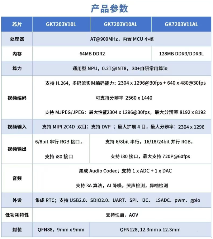 据介绍,GK7203V1 系列采用“ARM Cortex-A7 + RISC-V”双核架构,集成 0.2T 通用型 NPU,支持 STR 低功耗待机,内置 64MB / 128MB DDR,支持 DDR 自刷新,支持 H.264 编码及 1296P 高清视频处理,同时集成了 RTC、POR、USB2.0、SDIO、SPI、UART、I2C 和 RGB / I80 / BT.656 / BT.1120 / SPI 接屏等丰富的外设接口。