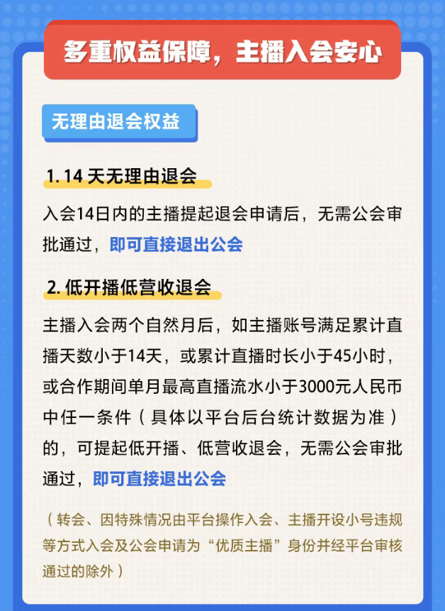 政策中提到,新主播将被赋予“无理由退会权益”:入会 14 天内的新主播,无需公会审批可直接退会;入会两个月主播,只要满足“累计开播不足 14 天”、“直播总时长未达 45 小时”或“单月最高流水低于 3000 元”三者任一条件,亦可免公会审批直接退会。