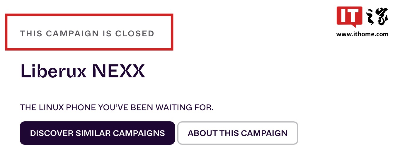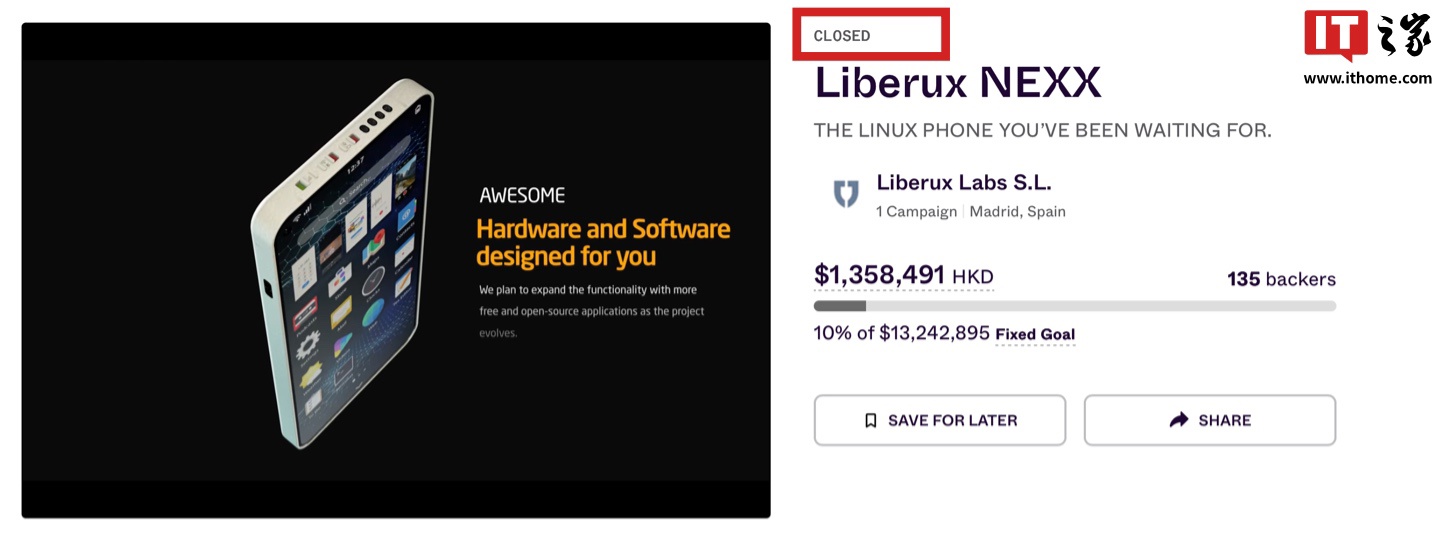 但截至IT之家发稿,目前该机众筹计划已确认失败,仅达到了 1/10 的众筹目标(1,358,491 港币,IT之家注:现汇率约合 124 万元人民币),作为比较,厂商原始众筹目标为 13,242,895 港币(现汇率约合 1209.2 万元人民币)。