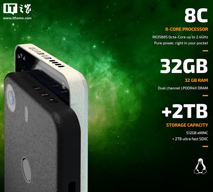 该机搭载 Rockchip RK3588S 处理器(4 个 Cortex A76 加 4 个 Cortex A55 核心,最高 2.4Ghz 频率),辅以 32GB LPDDR4x RAM,匹配可拆卸 512GB eMMC 存储。手机支持 5G、Wi-Fi 5 和蓝牙 5.0,并设有双 USB-C 接口。