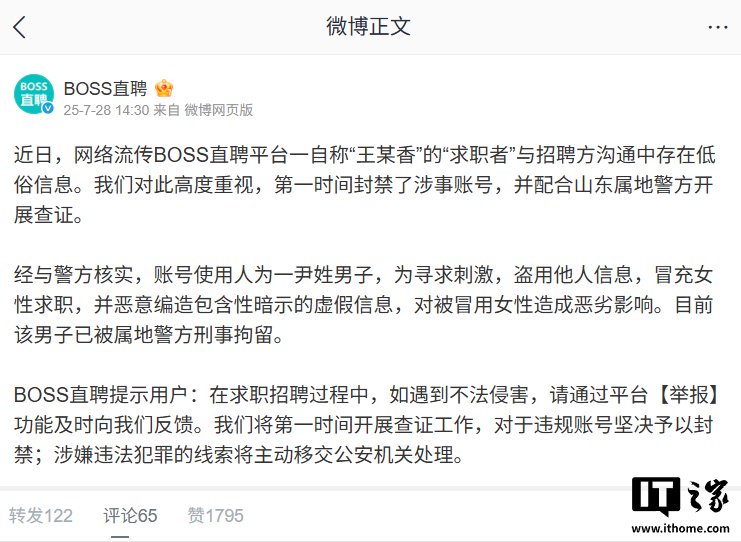 IT之家 7 月 29 日消息,上周,网上流传 BOSS 直聘平台一自称“王某香”的“求职者”与招聘方沟通中存在低俗信息,引发大量网民关注和讨论,扰乱网络空间秩序。IT之家注意到,BOSS 直聘官方及警方通报了此次案件详情,实为某男子编造。