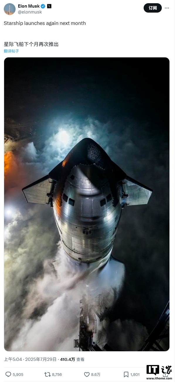 IT之家 7 月 29 日消息,马斯克今早在 X 上宣布 SpaceX 星舰将于下个月再次开启试飞。SpaceX 向美国联邦通信委员会(FCC)提交的文件显示,星舰的下一次发射计划将于 8 月 4 日进行。