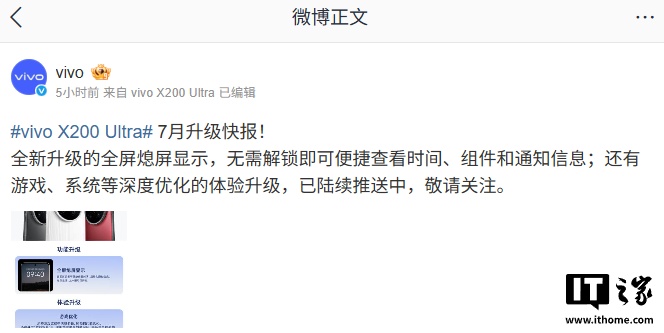 IT之家 7 月 29 日消息,vivo 官方今日发布 vivo X200 Ultra 手机 7 月升级快报。据介绍,该机本月将升级全屏熄屏显示,无需解锁即可便捷查看时间、组件和通知信息;还有游戏、系统等深度优化的体验升级。官方表示新版本已陆续推送中。