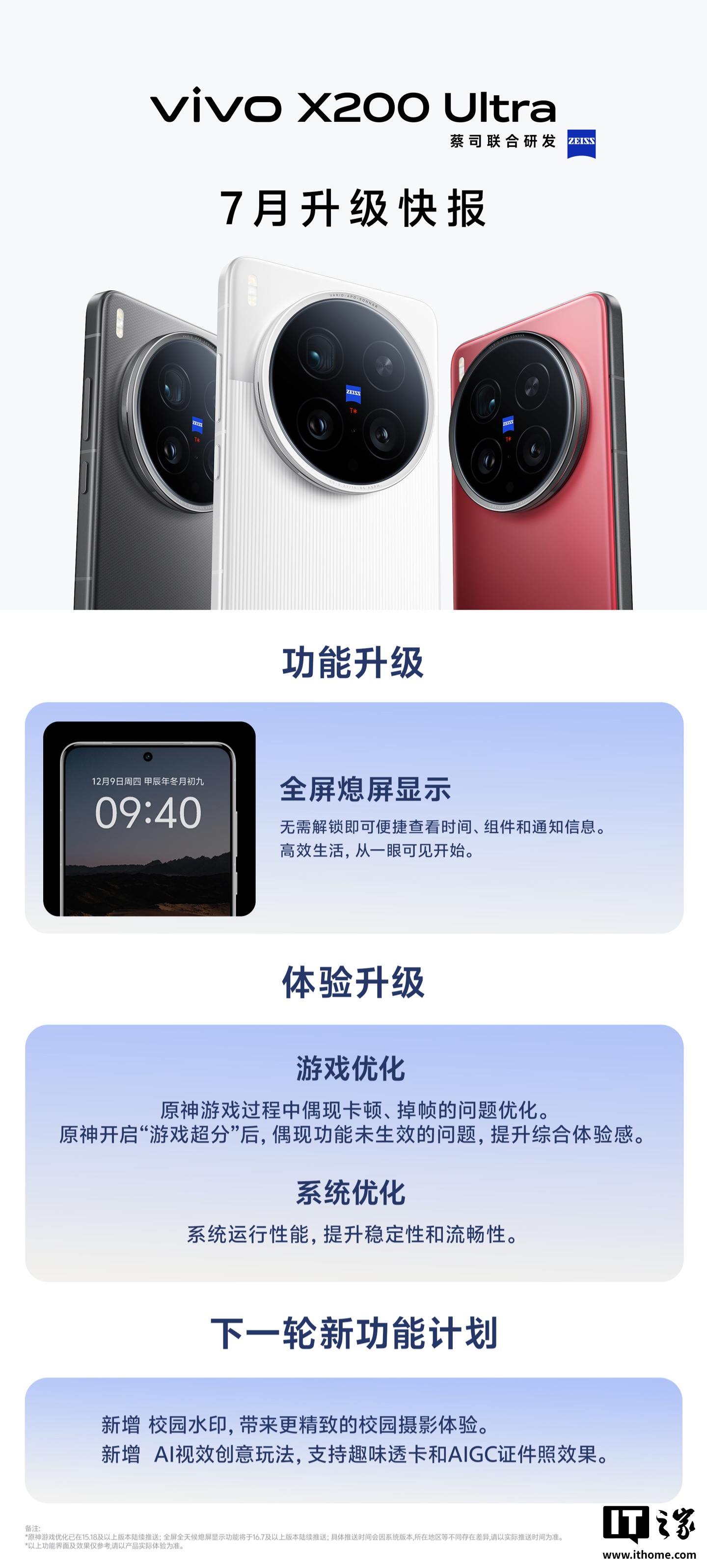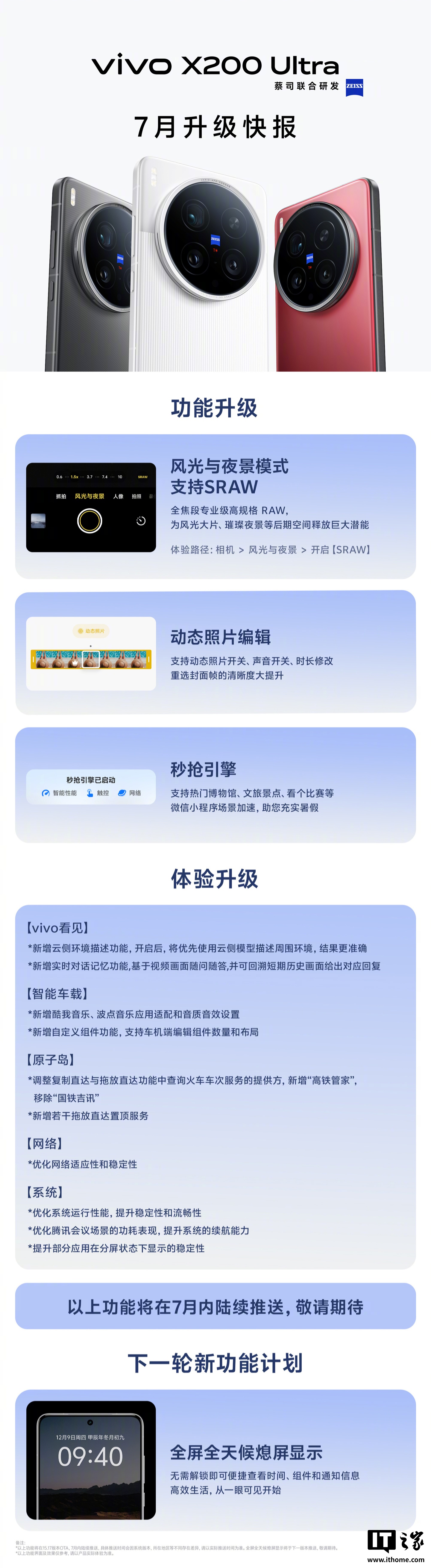 IT之家整理 vivo X200 Ultra 手机 7 月升级快报重点内容如下: