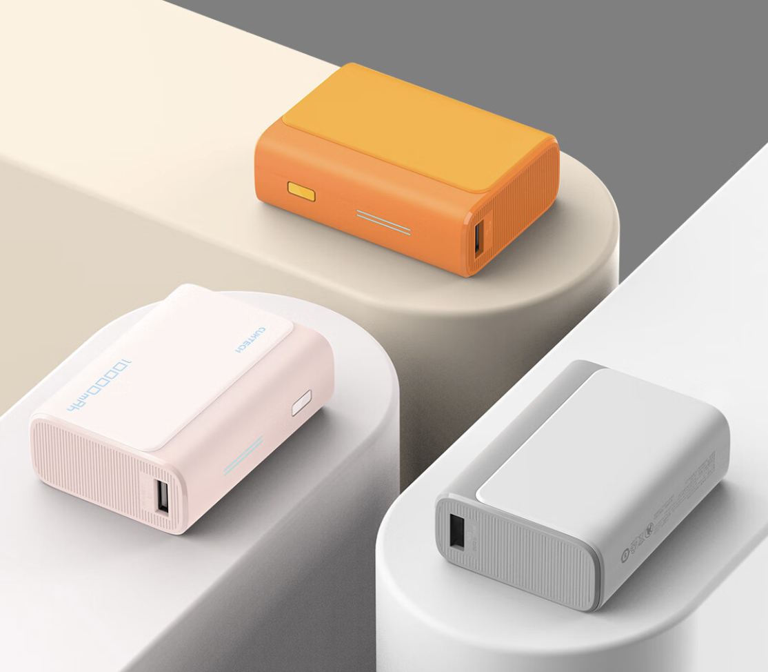 这款移动电源外观采用了同色系撞色设计,可选粉色、灰和橙;采用灯带设计,可显示剩余电量;正面面积和银行卡相当,重量为 195g;容量为 10000mAh,配备一个 USB-A 接口和一个 USB-C 接口,支持 30W 双向快充,兼容 UFCS 融合快充协议。