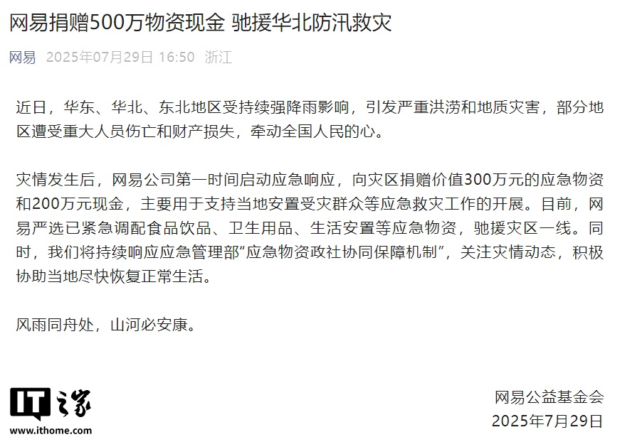IT之家 7 月 29 日消息,华东、华北、东北地区近期受持续强降雨影响,引发严重洪涝和地质灾害,部分地区遭受重大人员伤亡和财产损失,牵动全国人民的心。