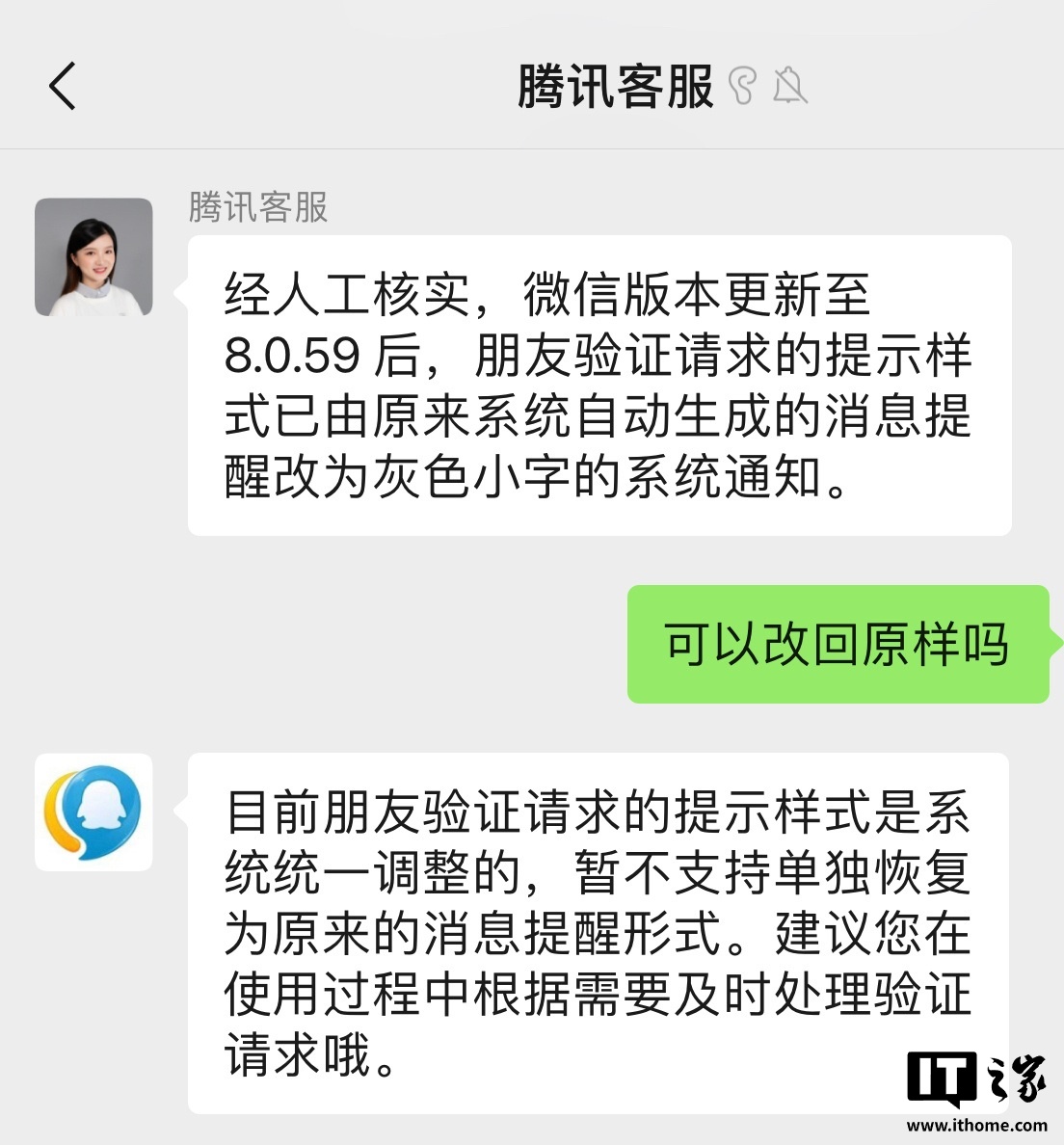 对此,腾讯客服回应称:经人工核实,微信版本更新至 8.0.59 后,朋友验证请求的提示样式已由原来系统自动生成的消息提醒改为灰色小字的系统通知。
