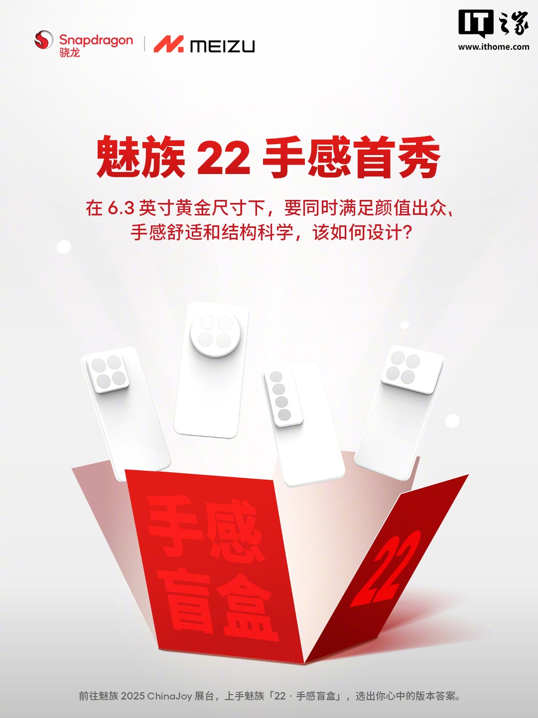 据IT之家此前报道,魅族科技官方微博昨日宣布,魅族「22・手感盲盒」已陈列,用户 8 月 1 日 - 4 日可在上海・新国际博览中心骁龙主题馆 N5-10 展台体验。预热海报显示,魅族 22 手机将采用 6.3 英寸黄金尺寸设计,要同时满足颜值出众、手感舒适和结构科学三大要求。