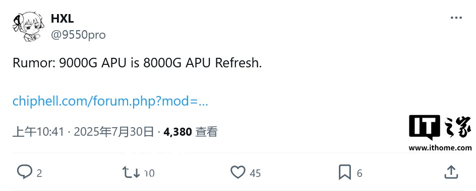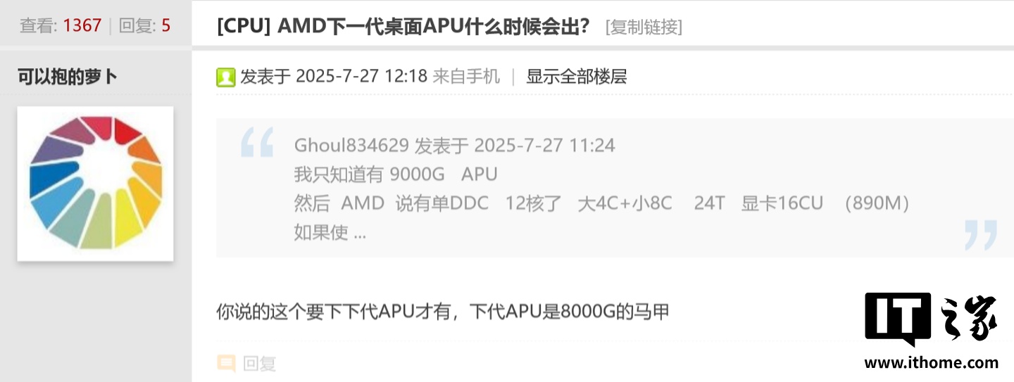 IT之家 7 月 31 日消息,网友 @可以抱的萝卜 于 7 月 27 日在 ChipHell 论坛上发帖,表示 AMD 的下一代桌面 APU 会是 8000G 的马甲,随后该帖子被消息源 @9550pro 转发。