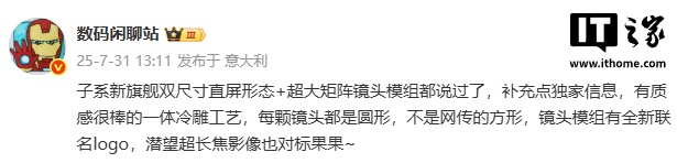 据爆料,该系列新旗舰采用双尺寸直屏形态 + 超大矩阵镜头模组,有质感很棒的一体冷雕工艺,每颗镜头都是圆形,不是网传的方形,镜头模组有全新联名 logo,潜望超长焦影像也对标苹果。