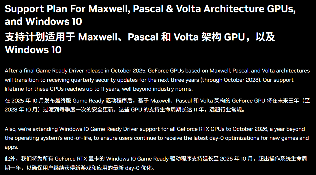 此外,英伟达宣布将在 2026 年 10 月停止对 Windows 10 系统的所有驱动程序支持。这是微软正式宣布的 Windows 10 结束支持日期的一年后。