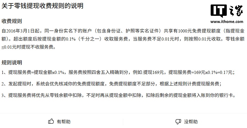 在此之前,“微信零钱”简介显示单个身份证终身享有 1000 元免费零钱提现额度;超出额度后按提现金额的 0.1% 收取服务费,单笔最低 0.1 元 / 笔。