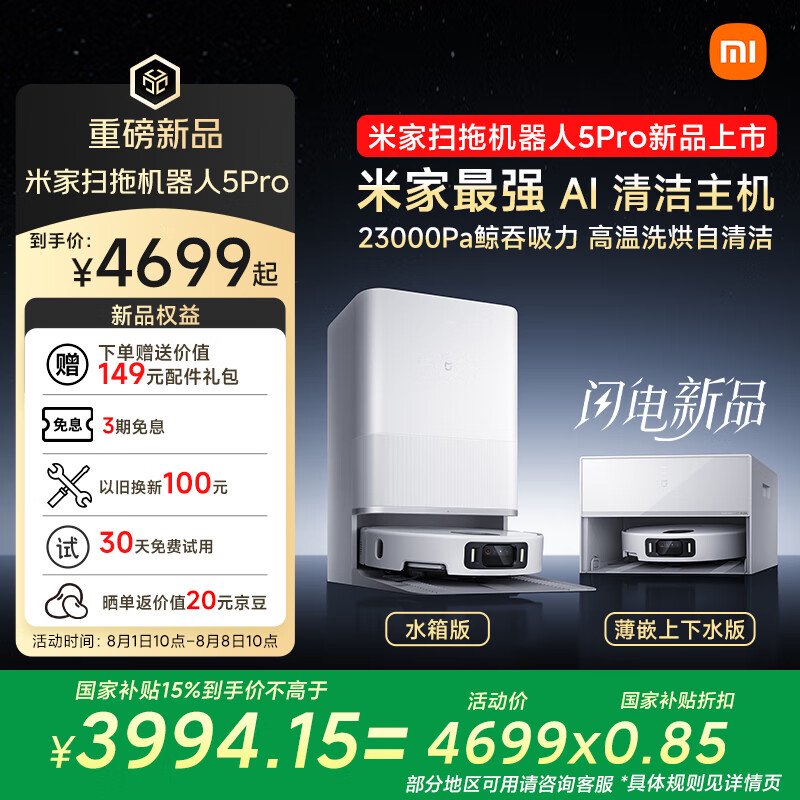 IT之家 8 月 1 日消息,小米米家扫地机器人 5 Pro 现已在京东开启预售,这款扫地机器人主打“23000Pa 吸力、高温洗烘自清洁”,水箱版 / 上下水版首发价分别为 3999 元 / 4699 元,部分地区国补后到手价分别为 3399.15 元 / 3994.15 元。