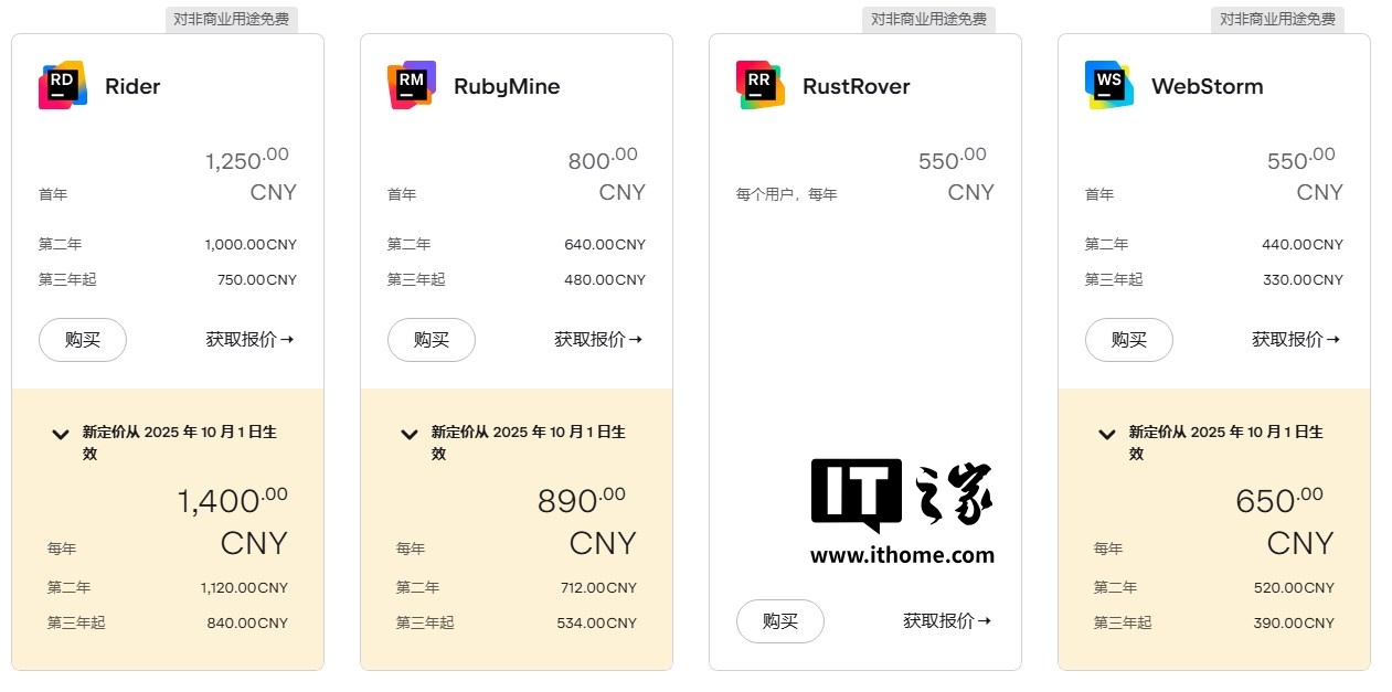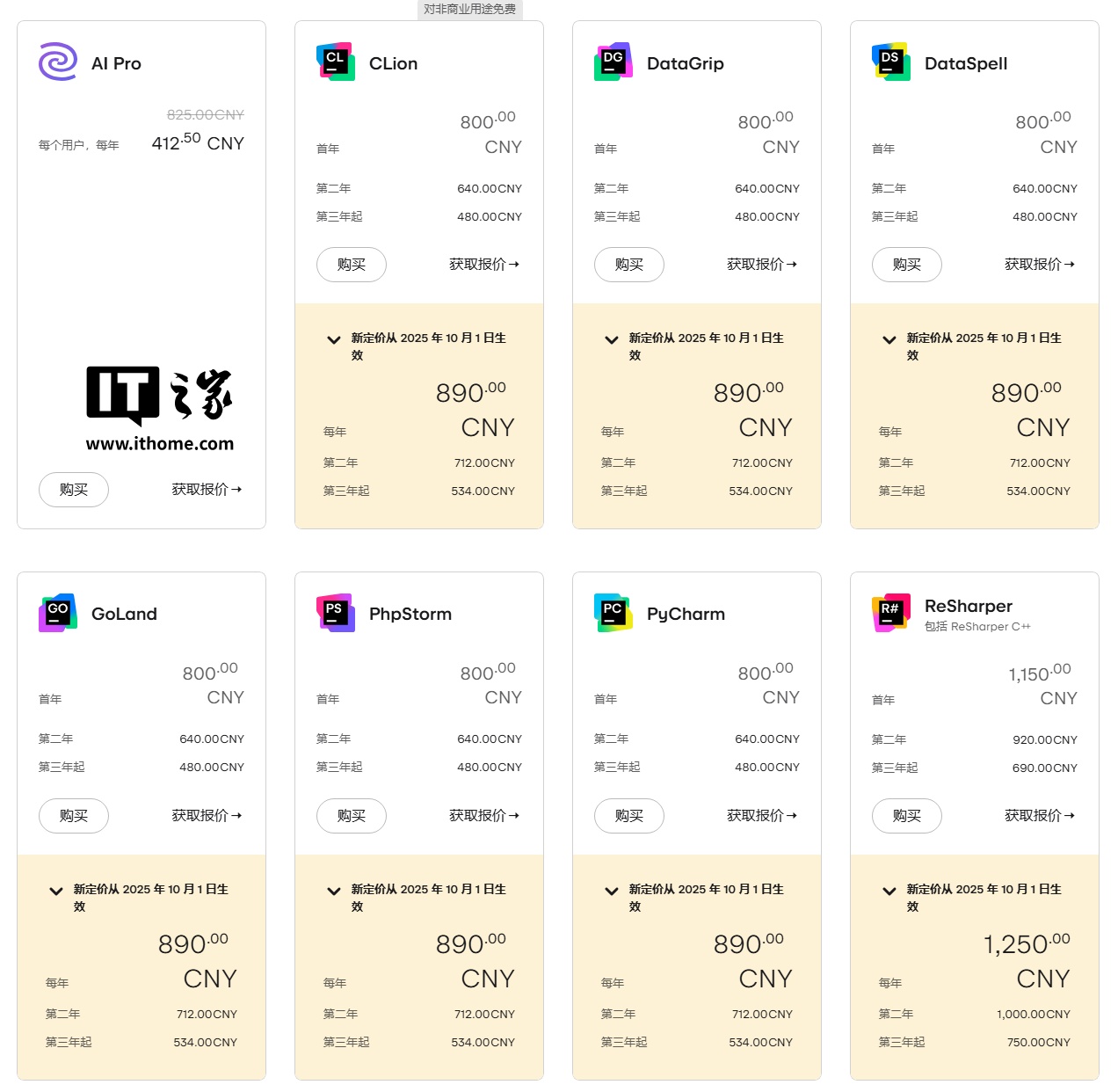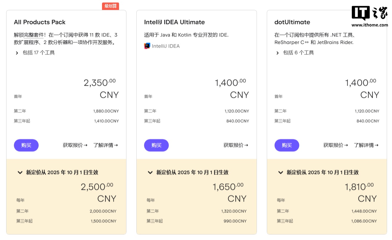 IT之家 8 月 2 日消息,Jetbrains 于 7 月 31 日发布公告,宣布将于 2025 年 10 月 1 日开始,上调集成开发环境(IDE)、.NET 工具、dotUltimate 和 All Products Pack 价格。